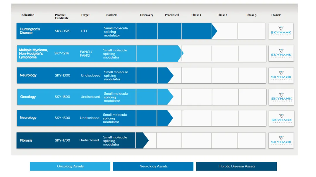 神经科学是Skyhawk内部管线的重点,其核心项目是一款处于II/III期的剪接调节剂SKY-0515,旨在通过减少突变型HTT的产生来治疗亨廷顿舞蹈症。除神经系统疾病外,Skyhawk 还在推进淋巴瘤和纤维化的临床前项目。
