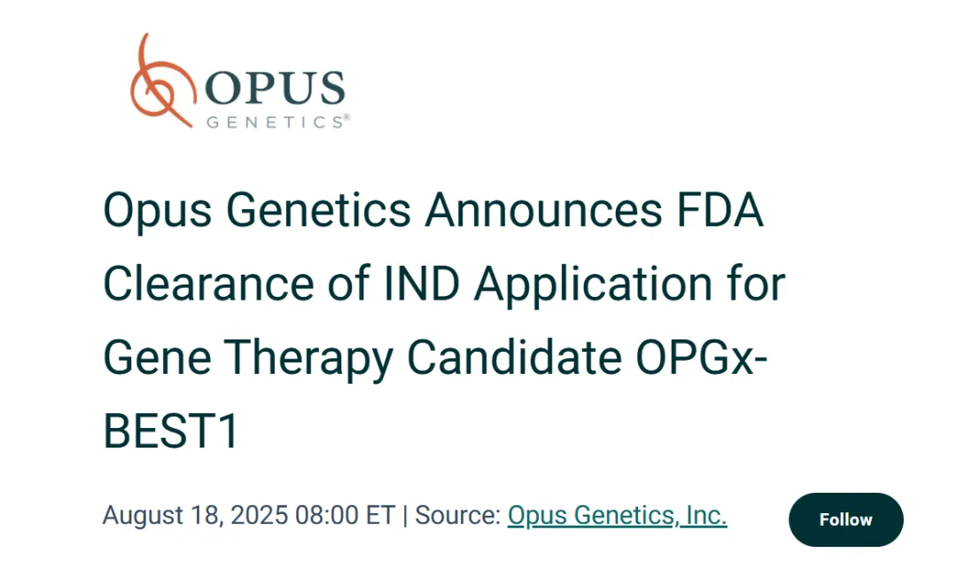 2025年8月18日,专注于开发治疗遗传性视网膜疾病(IRD)的基因疗法以及其他眼科疾病小分子疗法的临床阶段生物制药公司Opus Genetics宣布,美国食品药品监督管理局(FDA)已正式接受其针对OPGx-BEST1的研究性新药(IND)申请。OPGx-BEST1 是一种用于治疗BEST1基因突变相关IRD的基因疗法。