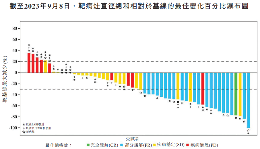 Ifebemtinib+PLD治疗PROC的1/2期临床数据如下,54例患者中43例肿瘤缩小,ORR为40.7%,DCR为81.5%,mDOR为7.7个月,mPFS为7.5个月。