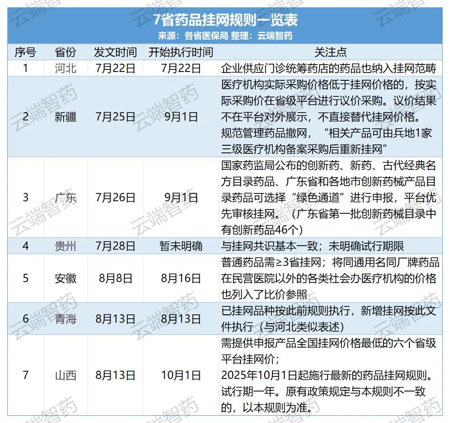 此前计划5月份内各省根据《挂网共识》调整挂网规则,但时间即将进入8月下旬,仅有7省发出正式方案。