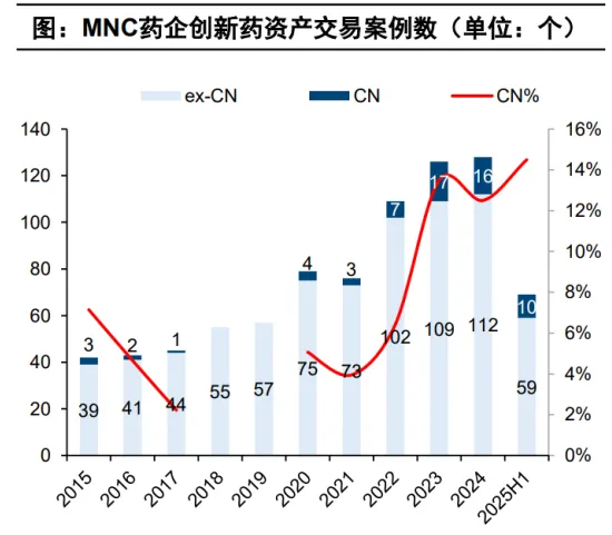 十年前几乎无人问津,但到2025年上半年,中国资产在MNC交易案例中的占比已接近15%,交易总金额占比超过20%。早期,这些交易多集中在肿瘤领域,但从2024年开始,授权与并购的触角已逐渐拓展至自身免疫和代谢等慢病领域。