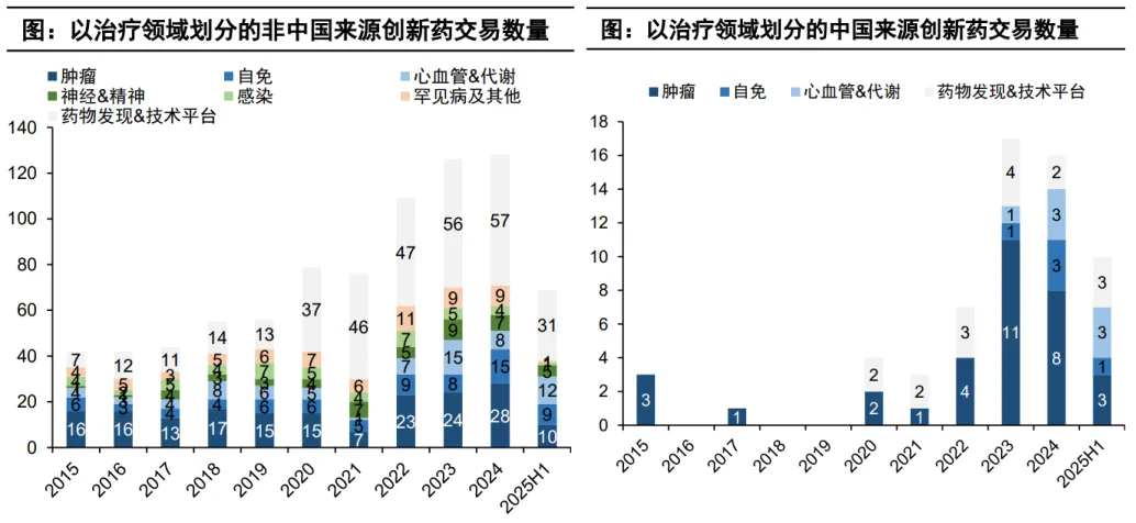 早期,它们多以小额授权和技术平台合作为主,药物发现与技术平台合作占比接近一半,显示出对早期研发的持续关注。在治疗领域上,肿瘤无疑是最受青睐的赛道,其次是自身免疫、心血管与代谢类药物,交易数量相对稳定。