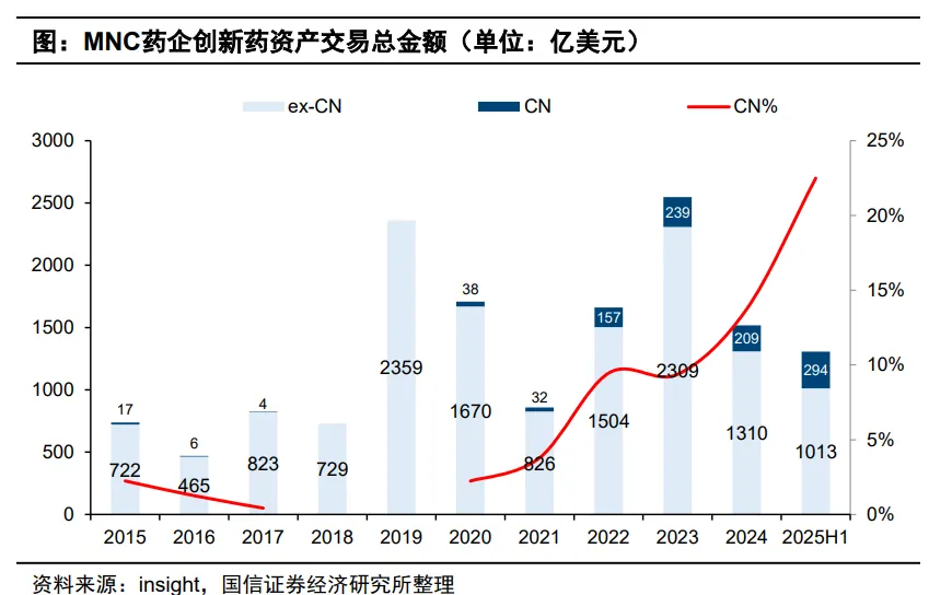 2025H1,MNC药企创新药交易中中国资产交易总金额达到294亿美元,占比~22%,其中三生制药与辉瑞、石药集团与阿斯利康、和铂医药与阿斯利康的交易就贡献了绝大部分金额。