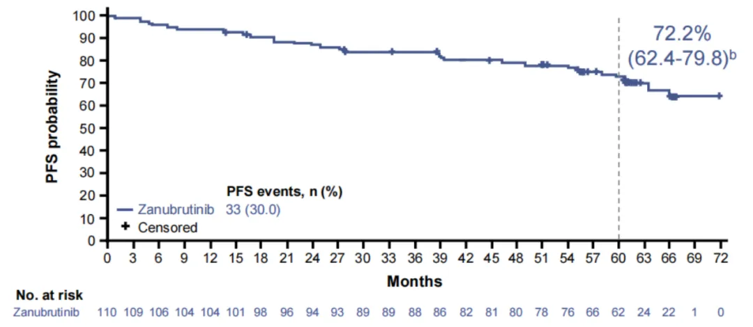 长期随访数据显示,泽布替尼针对初治不伴高危因素的CLL患者的5年PFS率高达76%。这意味着,患者获得长生存期且不复发的概率很大,或可提高患者的长期生活质量。