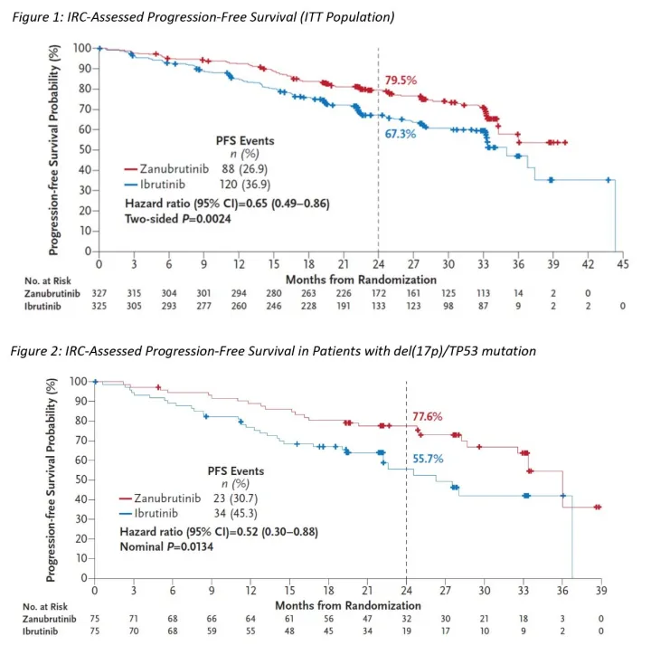 在此之前,阿可替尼的ELEVATE-RR研究是CLL/SLL领域首个BTK抑制剂“头对头”临床试验。结果显示,阿可替尼对于既往至少接受过一次治疗的高危CLL患者在改善PFS方面非劣效于伊布替尼。在安全性方面,阿可替尼的房颤/房扑发生率、不良事件导致的停药和死亡均低于伊布替尼。