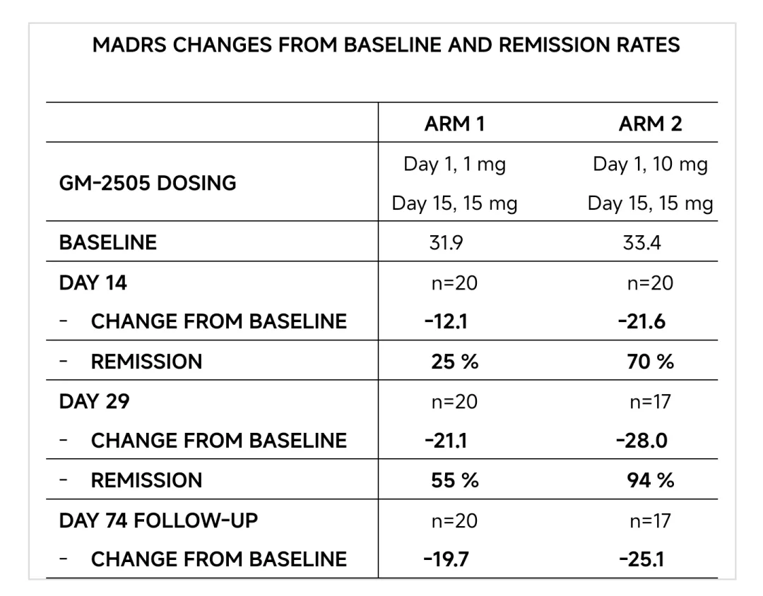 最近公布的Bretisilocin治疗MDD的2a期研究的积极顶线结果显示,在第14天,单剂量(10mg)的Bretisilocin显示出强大的抗抑郁效果,蒙哥马利-艾斯伯格抑郁评定量表(MADRS)总分从基线变化-21.6分,而低剂量(1mg)活性对照组从基线变化-12.1分(p = 0.003)。