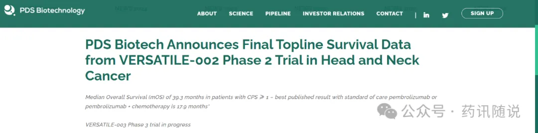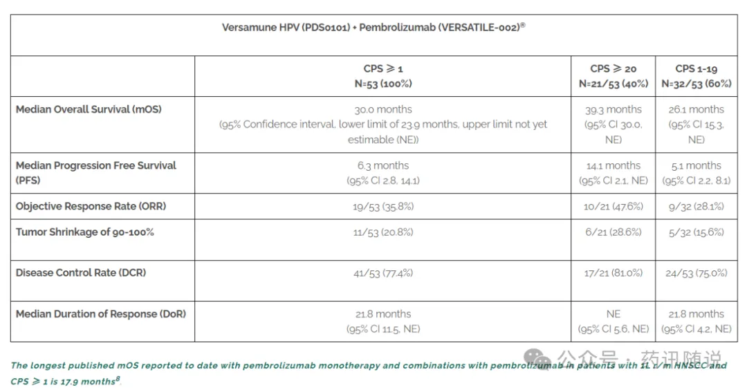 8月25日(当地时间),PDS Biotech宣布其靶向HPV16免疫疗法Versamune HPV(前称PDS0101)联合帕博利珠单抗(Pembrolizumab,商品名:可瑞达/Keytruda,俗称:K药)在HPV16阳性一线复发和/或转移性头颈部鳞状细胞癌(1L R/M HNSCC)2期临床研究(VERSATILE-002)最终生存(OS)数据:CPS≥1患者PDS0101+K药中位OS为39.3月(95%CI:23.9-NE),标准治疗K药或K药+化疗既往最好结果为17.9月(编注:非头对头研究)。