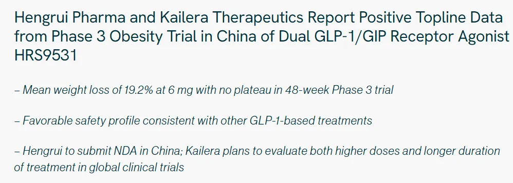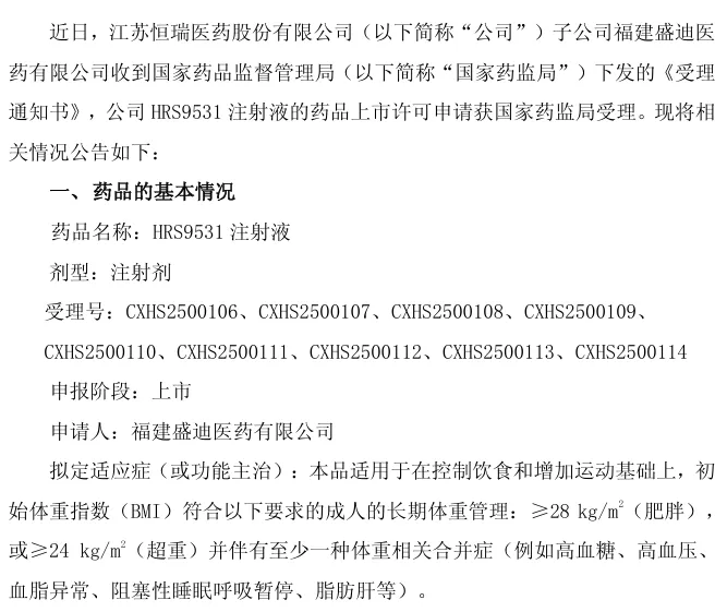 HRS9531注射液减重III期临床试验的完整结果将在即将举行的学术会议上公布。