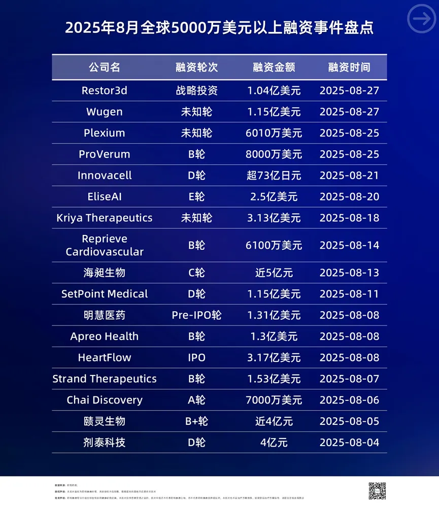 限于篇幅,本文无法对所有公司进行介绍,如需获取完整信息,请参阅《2025年8月全球5000万美元以上融资事件盘点》(详见下图)。