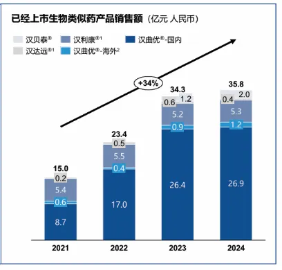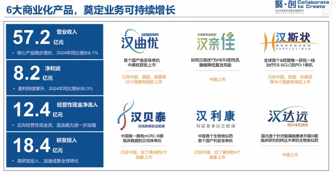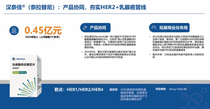 然而,复宏汉霖并不满足于现有成就,其正积极通过产品协同与国际化扩张挖掘更大的增长潜力。公司通过获得乳腺癌药物奈拉替尼的中国独家商业化权益,与汉曲优在HER2阳性乳腺癌治疗领域形成有力组合,旨在进一步降低患者复发风险,巩固并扩大其在核心治疗领域的市场地位。汉奈佳(奈拉替尼)在2024年已初显成效,贡献收入0.45亿元。