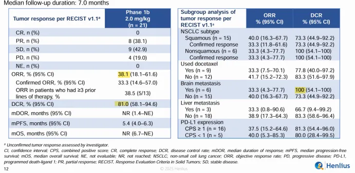 HLX43是目前全球首个且唯一进入II期临床的PD-L1 ADC。在2025年ASCO大会上,其I期数据首秀即引发高度关注。该研究展现了其“高效低毒”的BIC潜质,在非小细胞肺癌(NSCLC)中疗效亮眼:研究者评估的ORR为38.1%,DCR达81.0%,脑转移NSCLC 患者DCR更达到100%(图5),整体安全性良好。