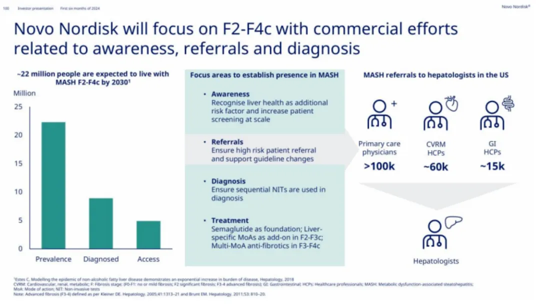 据诺和诺德管理层分享的估计数据,预计到2030年,整个F2-F4期MASH患者群体将达到约2200万。预计在3-5年后,欧美在治疗的MASH患者数量将达到千万量级。