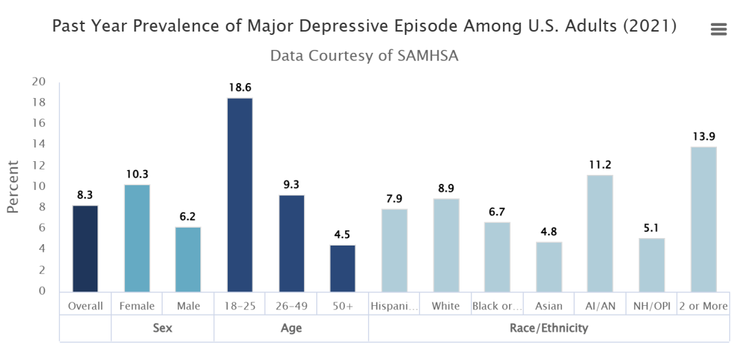 2021年,美国估计有2100万成人至少经历过一次重度抑郁发作,占所有美国成人的8.3%。其中,女性的发病率为10.3%,高于男性的6.2%,18-25岁年龄段的发病率为18.6%,是所有年龄段中最高的,在有多种(两个或以上)种族身份的人群中,重度抑郁发作的发病率最高,为13.9%(图1)[2]。