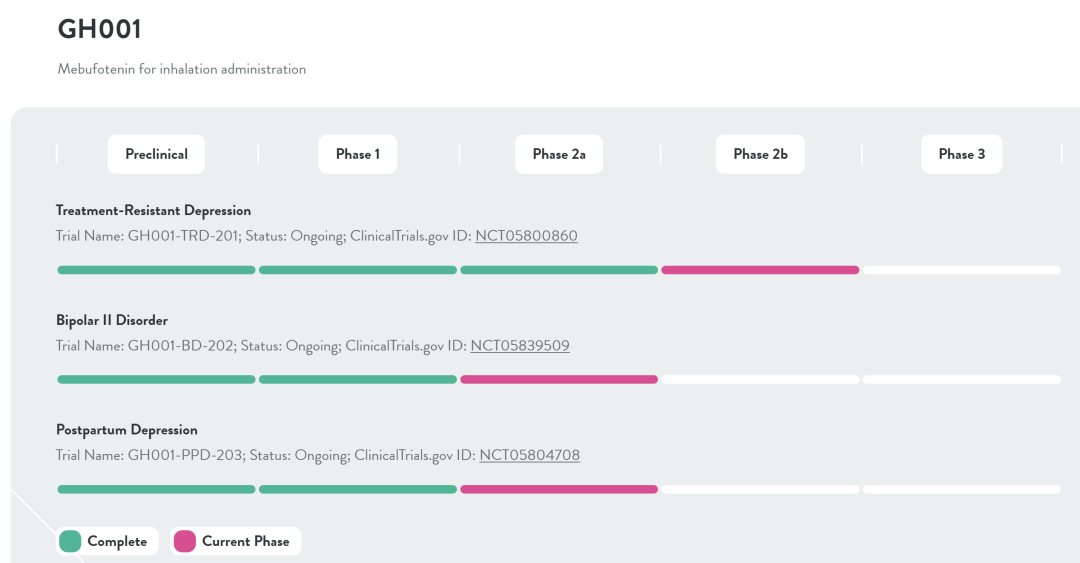 2025年2月,GH Research宣布GH001的一项用于难治性抑郁症(TRD)患者的随机、双盲、安慰剂对照2b期临床试验(GH001-TRD-201)达到了主要终点:GH001在第8天使蒙哥马利-阿斯伯格抑郁量表(MADRS)总分从基线显著降低15.2分,而安慰剂组增加了0.3分(差异为-15.5分,p<0.0001)。