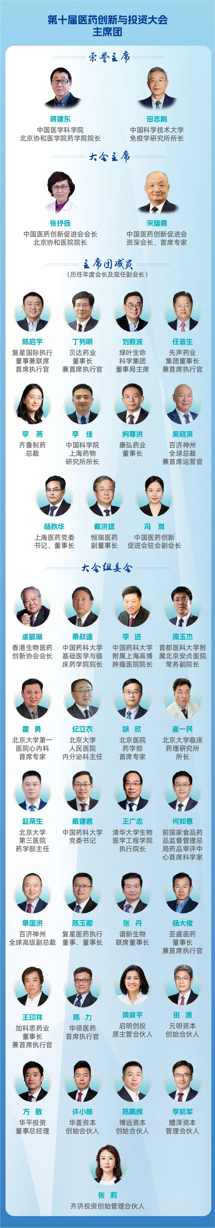 本届大会主席团汇聚了来自学术界、产业界与投资界的多位重量级嘉宾,在科学研究、产业创新与资本运作等领域成就卓著,实现“产、学、研、用、医”多方聚力、深度融合。主席团成员涵盖全国顶尖科研机构带头人、领军企业负责人及一线投资机构合伙人。将为大会带来更具前瞻性、高站位的指引与赋能,助力与会者把握行业脉搏、赋能创新增长。