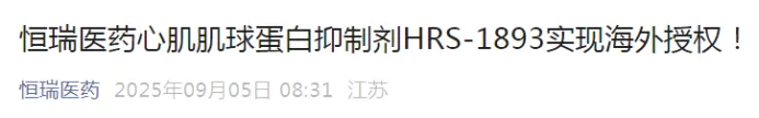 此次授权的HRS-1893是恒瑞医药自主研发的1类创新药,是一种高选择性的心肌肌球蛋白小分子抑制剂,可特异性抑制心肌肌球蛋白ATP酶活性,使心肌收缩性能正常化,减少左心室肥厚并改善舒张期顺应性。