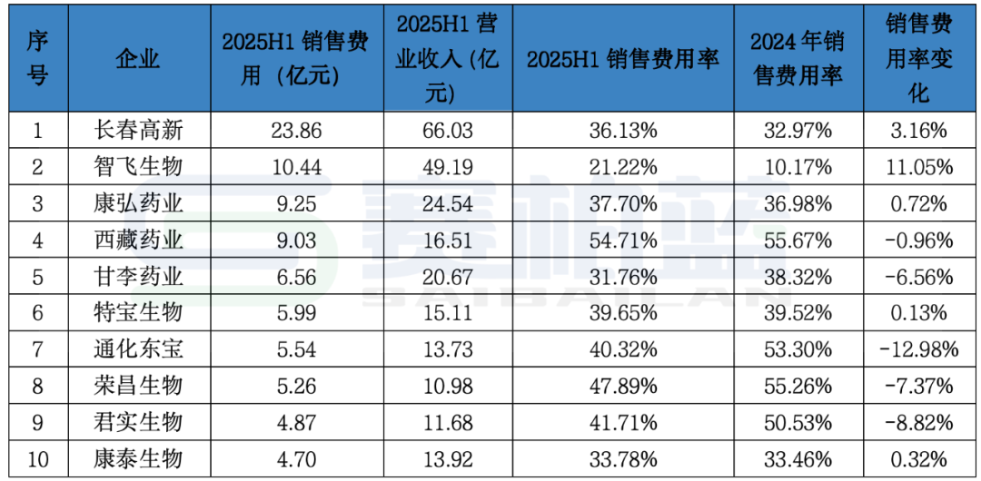 从销售费用率变化来看,A股生物制品行业上市公司2025年上半年销售费用率前十企业较2024年全年下降和上升的企业各有五家。
