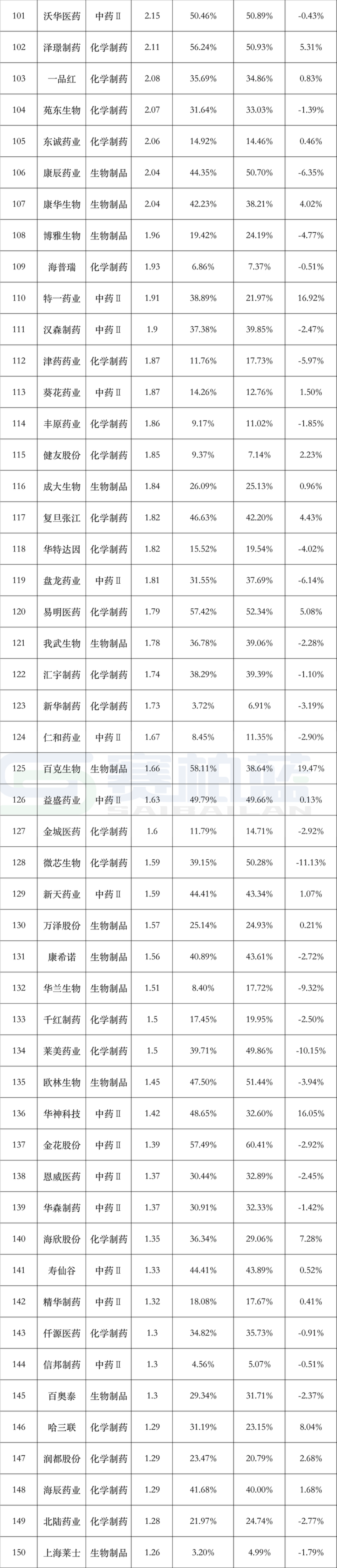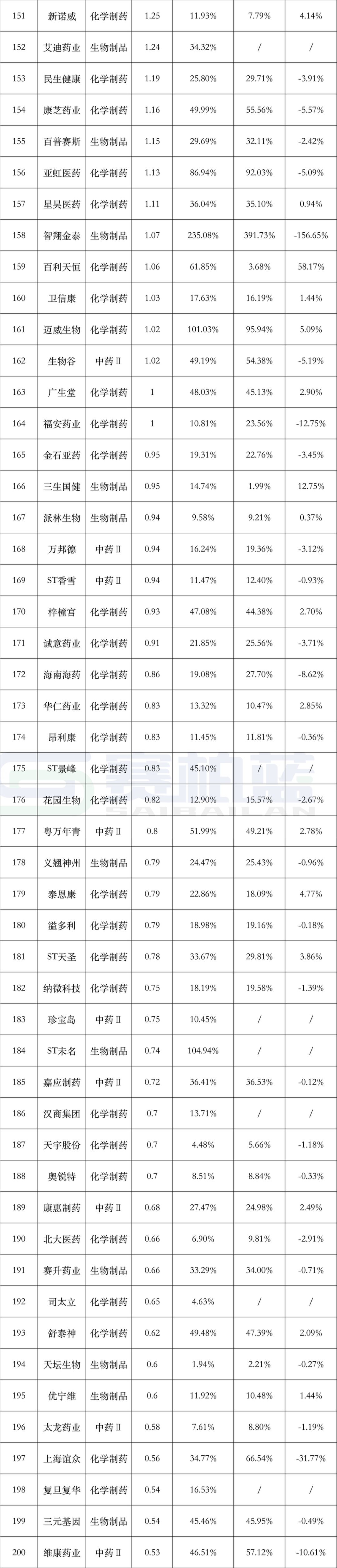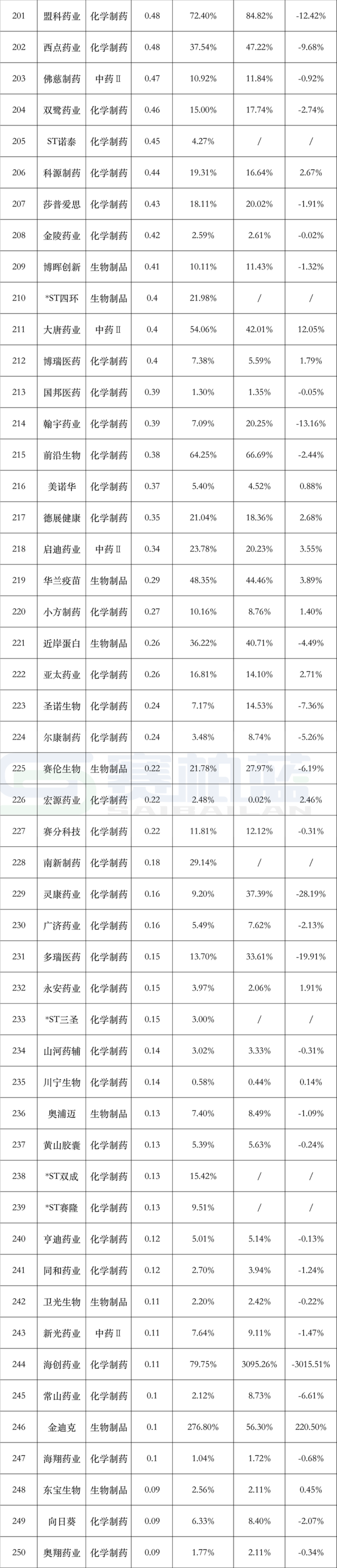 从销售费用率变化来看,A股化学制药行业上市公司2025年上半年较2024年全年多数保持上升,上升的几家也在0.5个百分点以内。