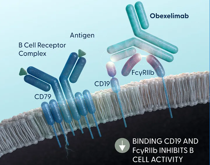 Obexelimab是一种CD19×FcγRIIb双功能单抗,旨在同时结合CD19与抑制性Fcγ受体,强化对B细胞功能抑制,进而抑制更广泛的B细胞群。