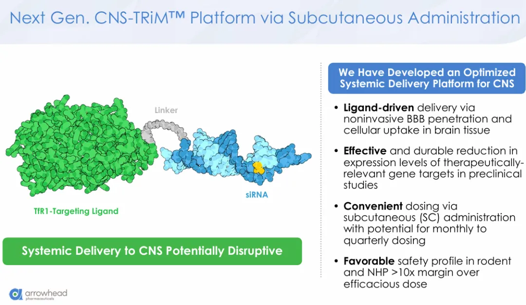 诺华此次看中的可能正是这一应用潜力。目前,针对帕金森病和其他神经退行性疾病,亟需全新的方法将 RNA 药物输送到大脑,而 Arrowhead 的 TRiM™技术能够在关键大脑结构中实现广泛且有效的递送。