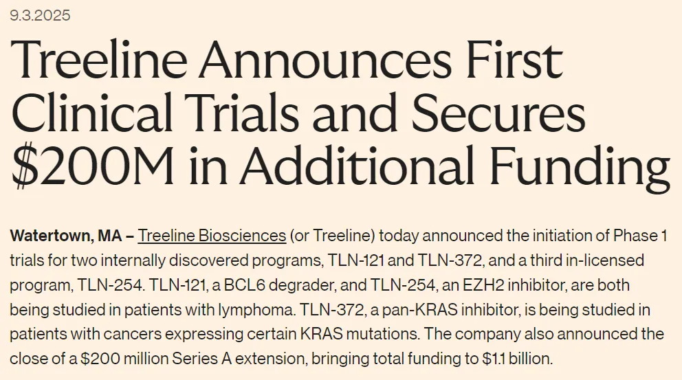 9月3日,马萨诸塞州沃特敦,Treeline Biosciences宣布启动两个内部发现的项目TLN-121和TLN-372以及第三个引进恒瑞医药开发的项目TLN-254的1期临床试验。TLN-121(一款BCL6降解剂)和TLN-254(一款EZH2抑制剂,泽美妥司他片)在淋巴瘤患者中进行研究。TLN-372是一种泛KRAS抑制剂,正在对表达某些KRAS突变的癌症患者进行临床研究。该公司还宣布完成2亿美元的A+轮融资,使融资总资金达到11亿美元。