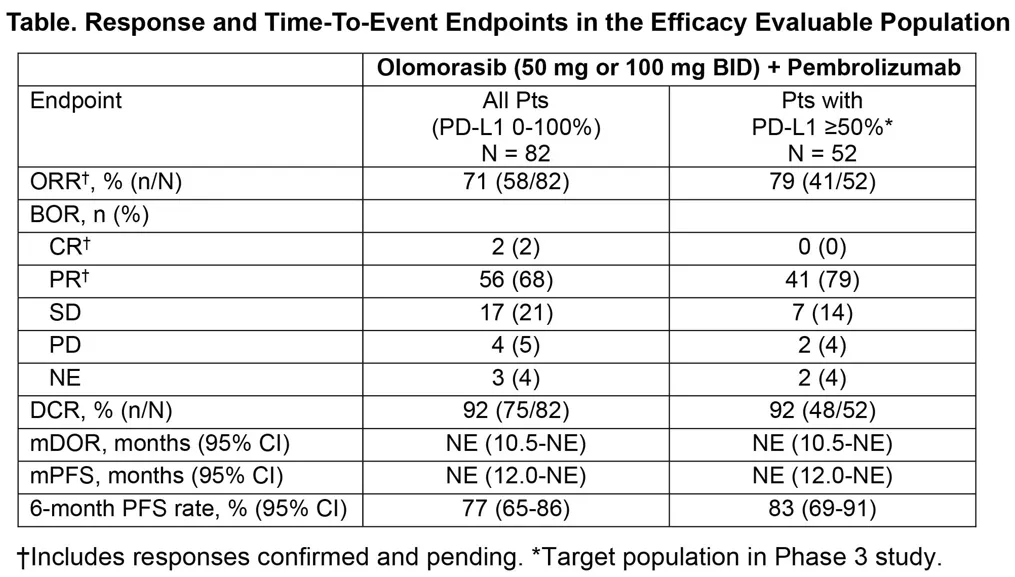 疗效方面,在所有可评估患者(n=82)中,客观缓解率(ORR)为71%,疾病控制率(DCR)为92%;在PD-L1≥50%且接受每日两次100 mg olomorasib治疗的患者中(n=26),ORR高达85%,DCR为92%。此外,该联合疗法展现出持久疗效,中位缓解持续时间(DOR)尚未达到,6个月无进展生存率达到77%。