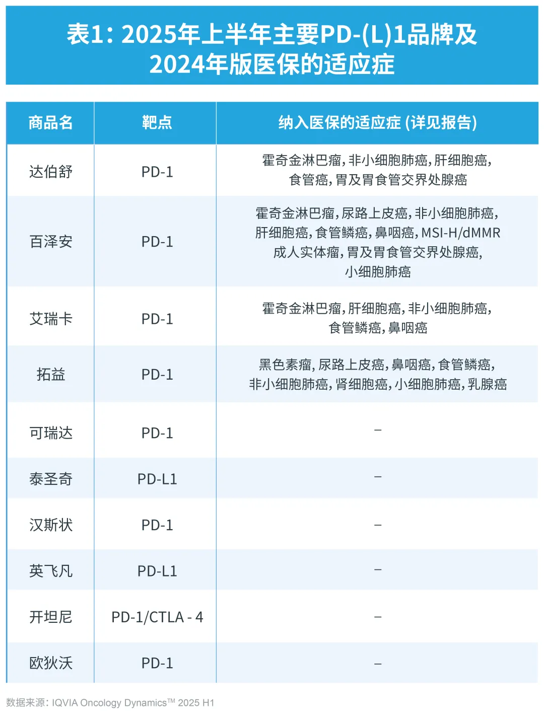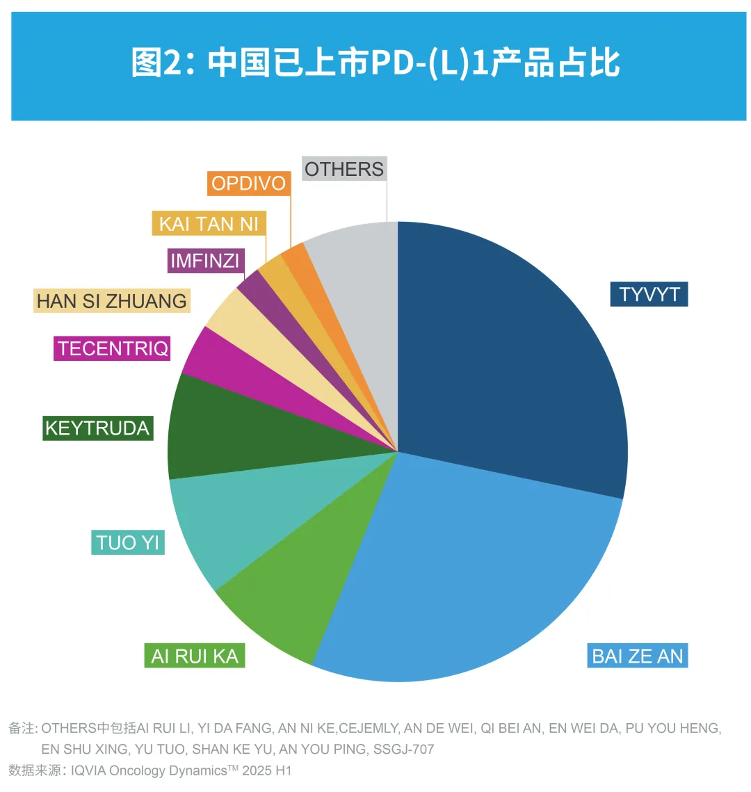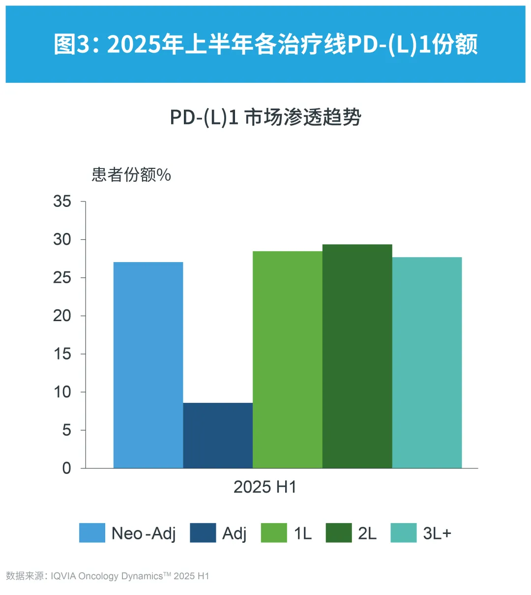 基于IQVIA肿瘤动态信息报告(Oncology Dynamics™,OD)2025年上半年最新数据分析,中国PD-(L)1市场报告正式出炉。根据数据分析显示,2025年上半年肿瘤治疗免疫类药物PD-(L)1的市场患者使用占比保持增长,与2024年下半年相比,增长率为4.0%,与2024年上半年同比,仍有7.3%的增长率,患者使用占比保持持续上升。