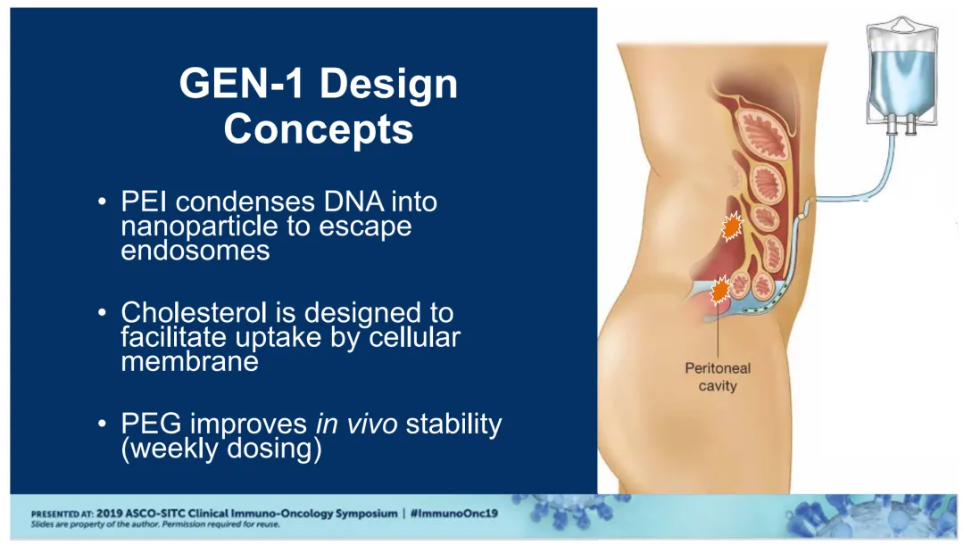 为此,公司特别设计了“PEG(聚乙二醇)-PEI(聚乙烯亚胺)-Chol(胆固醇)”腹腔内给药系统,PEG作用是改善体内稳定性(实现每周一次给药),PEI能够通过将DNA压缩成纳米颗粒并帮助DNA逃避内吞体的降解,胆固醇则是有助于细胞膜摄取。