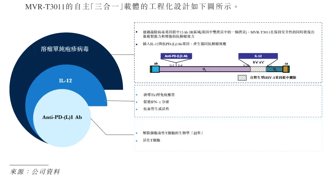 另外,MVR-T3011的基因组中分别整合了整合了IL-12的基因、抗PD-1单链抗体(scFv) 的基因,这意味着病毒能在肿瘤局部感染细胞,MVR-T3011在细胞内成为一个“原位工程”,一方面发挥IL-12功能促进T细胞和NK细胞的增殖与活化,另一方面直接生产PD-1抗体并分泌到肿瘤微环境中。