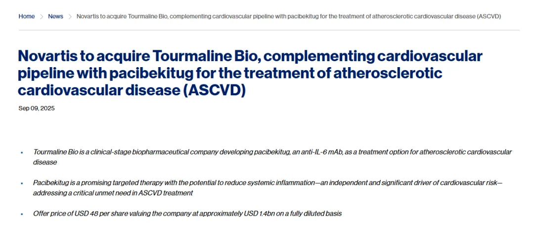https://www.novartis.com/news/media-releases/novartis-acquire-tourmaline-bio-complementing-cardiovascular-pipeline-pacibekitug-treatment-atherosclerotic-cardiovascular-disease-ascvd#:~:text=Basel%2C%20September%209%2C%202025%20%E2%80%93%20Novartis%20today%20announced,as%20a%20treatment%20option%20for%20atherosclerotic%20cardiovascular%20disease.