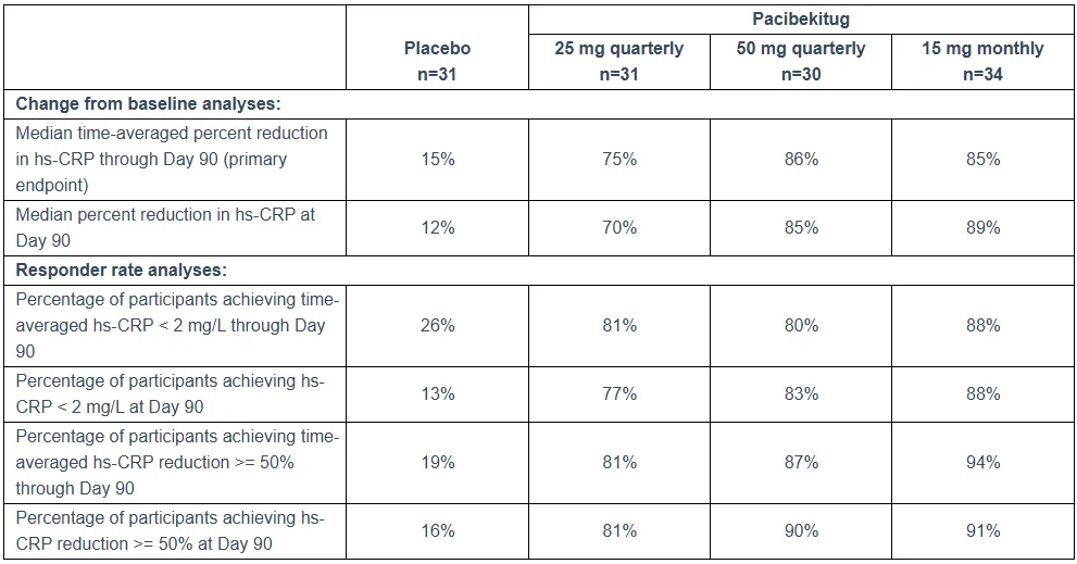 2025年5月20日发布的TRANQUILITY 90天II期临床研究结果显示,Pacibekitug 每月给药一次,每次15毫克可使高敏C反应蛋白 (hs-CRP) 水平中位数降低85%;每季度给药一次,每次50毫克,可使hs-CRP水平中位数降低86%;不良事件和严重不良事件的总体发生率与安慰剂相当。这些令人鼓舞的结果凸显了 Pacibekitug 有望通过比现有疗法更有效地靶向残留炎症风险,并方便地每季度给药一次,从而满足心血管治疗领域尚未满足的需求。