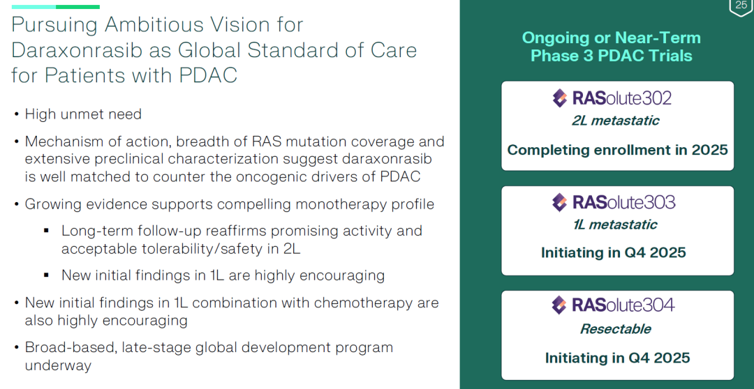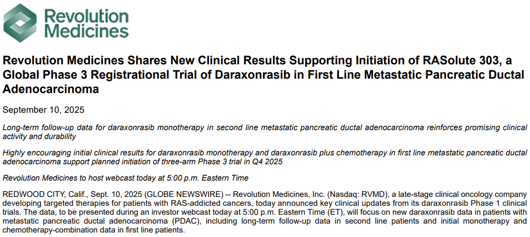 2025年9月10日,Revolution Medicines公布RMC-6236(Daraxonrasib)治疗转移性胰腺癌最新临床数据,计划今年四季度启动一线治疗胰腺癌的三期临床试验RASolute 303。
