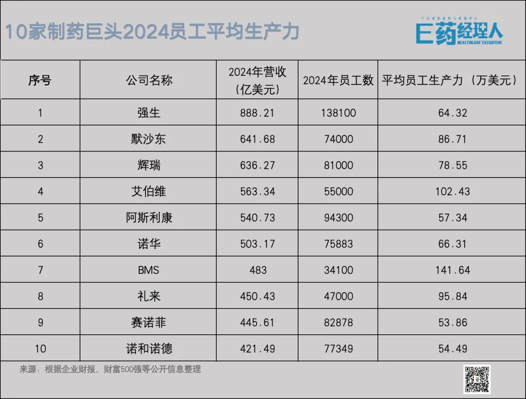 将制药企业在2024年的总收入平均到每位员工身上,计算每位员工为公司带来多少收入,能够看到,人均生产力过百万美元的大型MNC只有两家——艾伯维与BMS,其次最接近百万的,仅有礼来。