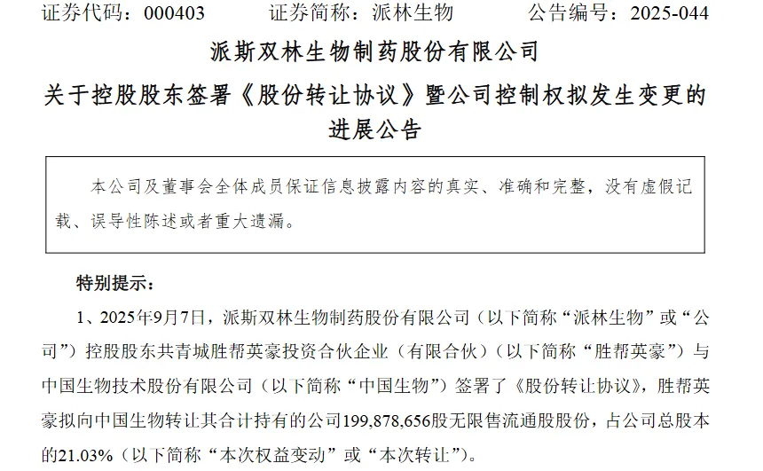 2025年9月7日,中国生物技术股份有限公司(以下简称“中国生物”)与派林生物(证券代码:000403.SZ)控股股东共青城胜帮英豪投资合伙企业签署股份转让协议,以约47亿元现金收购其持有的派林生物约21.03%的股份,交易溢价率在30%至32%之间。若交易顺利完成,中国生物将成为派林生物的控股股东,而中国医药集团有限公司(简称“国药集团”)则成为其实际控制人。