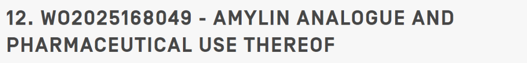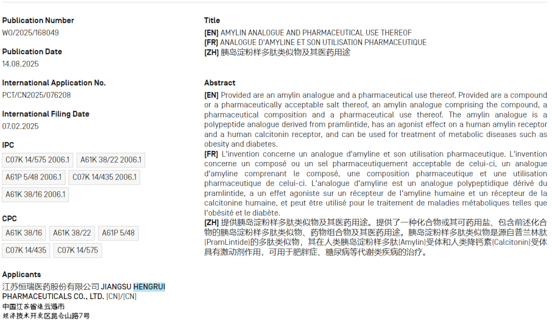 2025年8月14日,恒瑞医药递交了Amylin类似物的PCT专利申请。