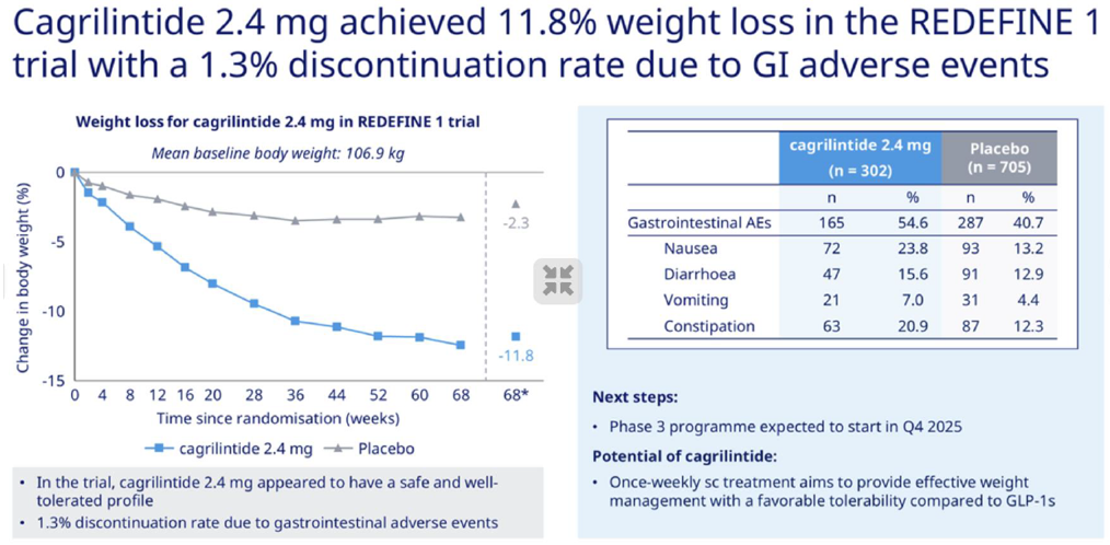 诺和诺德Cagrilintide已经完成减重三期临床POC,包括与司美格鲁肽联用的三期临床。
