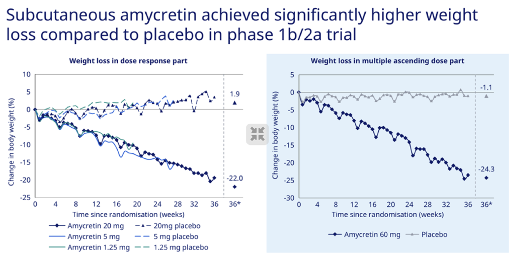 诺和诺德GLP-1/Amylin双靶点激动剂Amycretin,治疗36周减重22%,优于GLP-1+Amylin,预计2026年一季度启动三期临床试验,但20mg副作用较大。