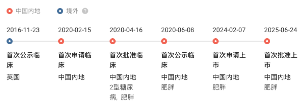 2019 年 9 月,信达与礼来达成许可协议,获得玛仕度肽在中国的开发和商业化权益。2020 年 2 月,信达便向 CDE 提交了肥胖和 2 型糖尿病的临床试验申请,时隔两年,又提交了这款 FIC 新药的上市申请。今年 6 月,该产品成功在国内获批上市,用于成人患者的长期体重控制。