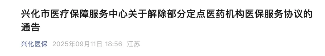 9月11日,江苏兴化医保公布了一批解除医保服务协议的名单,涉及4家诊所。