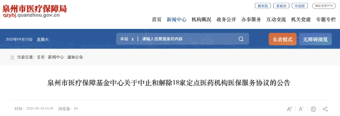 9月10日,福建泉州医疗保障基金中心发布公告,中止和解除18家定点医药机构医保服务协议,其中中止医保服务协议的医药机构有5家。