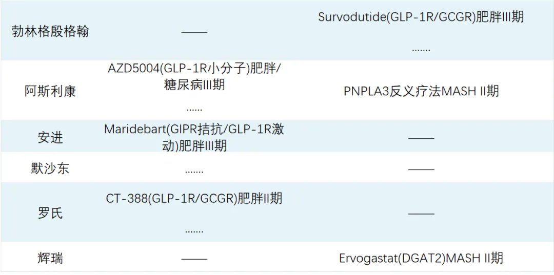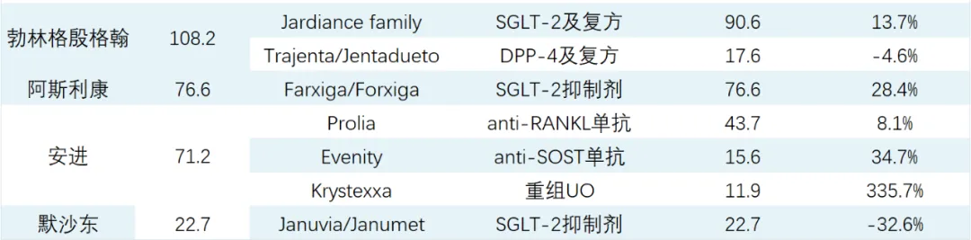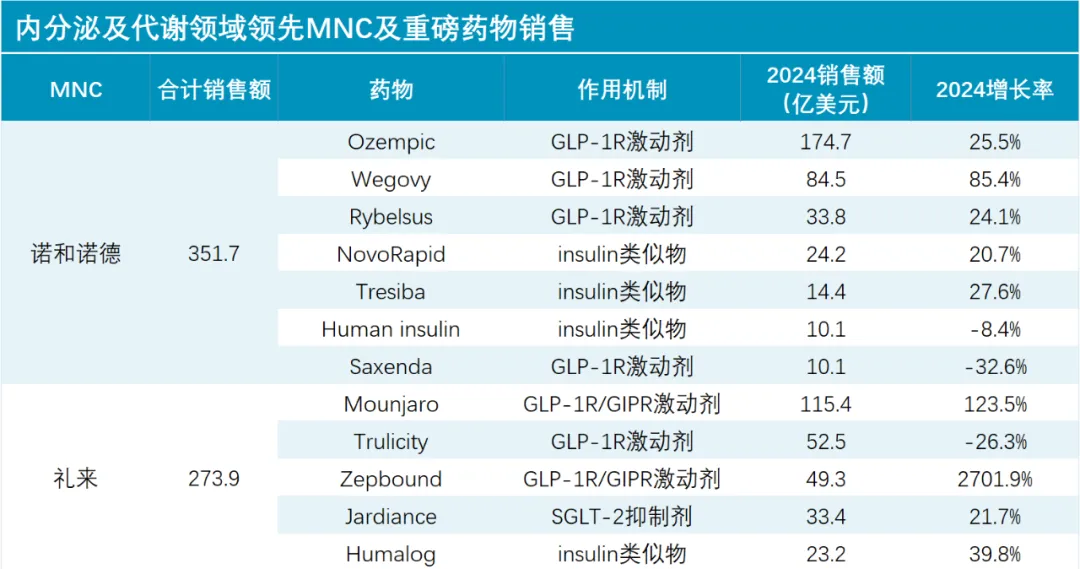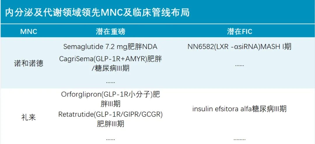 ★ 其他MNC:勃林格殷格翰、阿斯利康依赖SGLT-2抑制剂(Farxiga、Jardiance),安进则聚焦非糖尿病/肥胖细分领域(如抗骨代谢药物Prolia)。