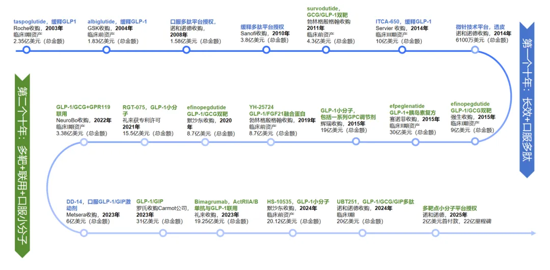 ★ 交易趋势来看:前10年以长效+口服多肽为竞争角逐,后10年向多靶+联用+口服小分子发展。