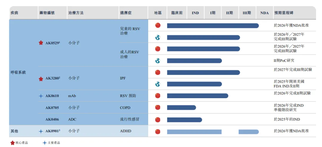 此外,爱科百发还开发了 2 款临床前资产包括:AK0705,小分子新药,用于治疗慢性阻塞性肺疾病(COPD);AK0406,一种 ADC,用于治疗流行性感冒。
