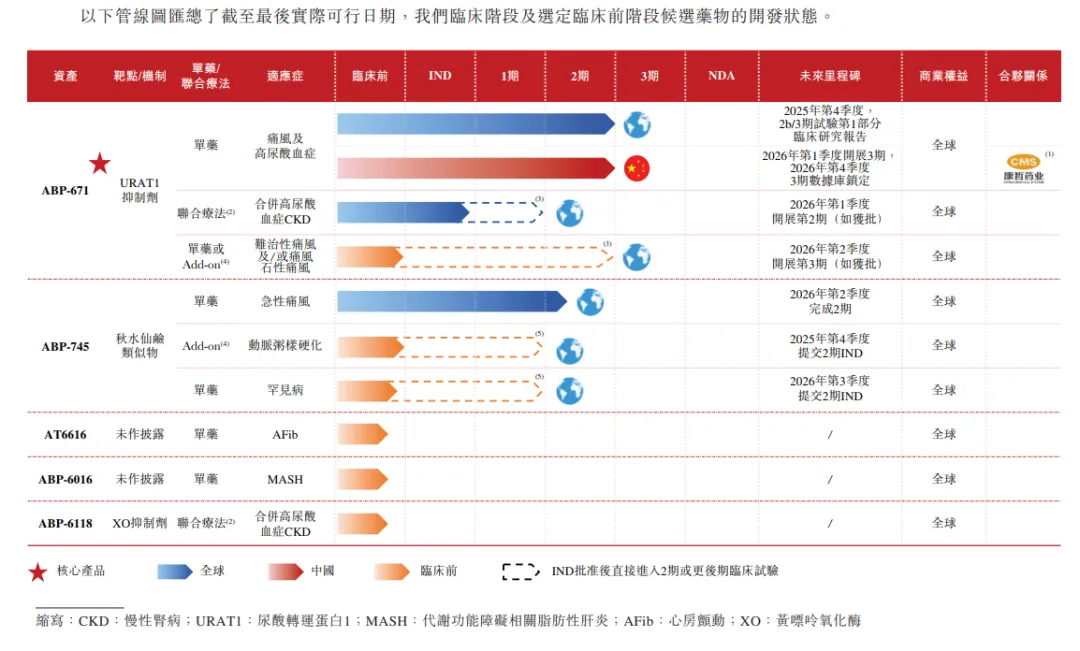 目前,ABP-671 正在美国和中国同步开展用于治疗痛风和高尿酸血症的 Ⅱb/Ⅲ期临床试验。同时,ABP-671 也具有治疗合并高尿酸血症 CKD 以及难治性痛风的潜力。新元素医药计划在 2026 年第一季度启动 ABP-671 针对合并高尿酸血症 CKD 适应症的 Ⅱ 期临床研究。