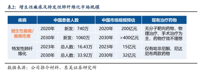 目前,对于HTS和瘢痕疙瘩缺乏有效的治疗药物,每年新发以及存量患者众多,存在较大未被满足的临床需求。