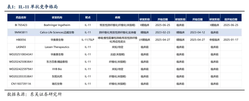 从竞争情况看,目前全球仅有3款IL-11单抗进入临床阶段,其中勃林格殷格翰(BI)的小分子抑制剂BI-765423进度最快,针对IPF已进入II期临床;迈威生物紧随其后,已完成中澳I期临床;华奥泰生物的TSLP/IL-11双抗HB-0056已处于I期临床。