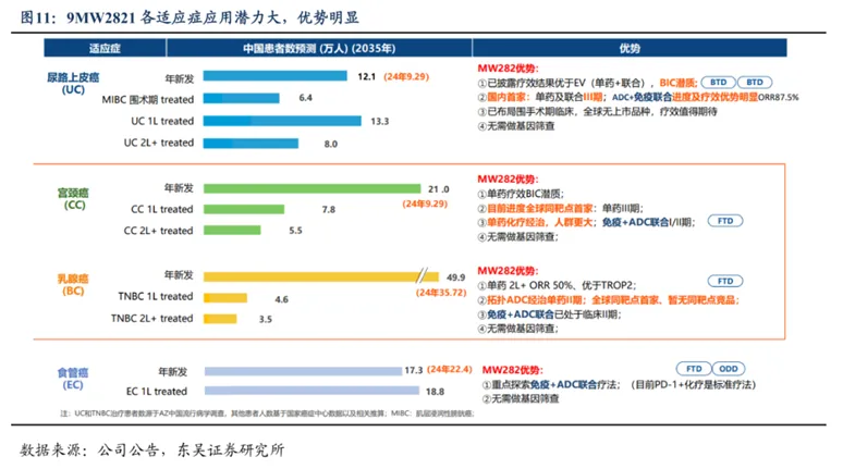 例如,核心产品9MW2821所处的Nectin-4 ADC赛道竞争较为火热,既有全球首款上市药物——安斯泰来与Seagen联合开发的维恩妥尤单抗(Padcev),又有许多竞品已进入临床阶段,包括恒瑞医药SHR-A2102、石药集团SYS6002、科伦博泰SKB410、礼来的LY4052031和ETx-22等。