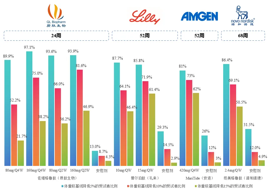 更值得关注的是,佐维格鲁肽在减重达标率方面表现突出,仅24周的治疗周期内,使用佐维格鲁肽达到体重减轻≥5%和≥10%的受试者比例就已超过或与其他GLP-1药物治疗一年的数据持平,有望提供更高的治疗成功率。