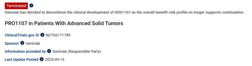 近日,全球临床试验收录网站clinicaltrials显示,Genmab已终止GEN1107(PRO-1107)用于实体瘤的一项I/II期研究(NCT06171789),原因是“因为其总体获益-风险特征不再支持继续研发。”
