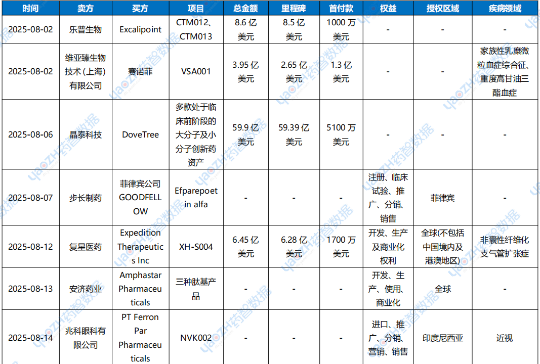 2025年8月,中国创新药出海继续落地多项单笔大额交易:复星医药将FXS6837(小分子抑制剂)授权给Sitala Bio,交易总额6.7亿美元;荣昌生物就RC28-E(眼科双抗)与参天制药达成合作,首付款2.5亿元人民币。肿瘤仍是MNC关注焦点,临床前/早期项目占比高,显示“中国源头创新”溢价持续提升。故中国创新药在全球市场竞争力日益凸显,海外MNC纷纷购买国内创新药资产补充管线,中国生物医药领域正以license out为核心驱动,完成从技术跟随到全球价值输出的历史性跨越 。